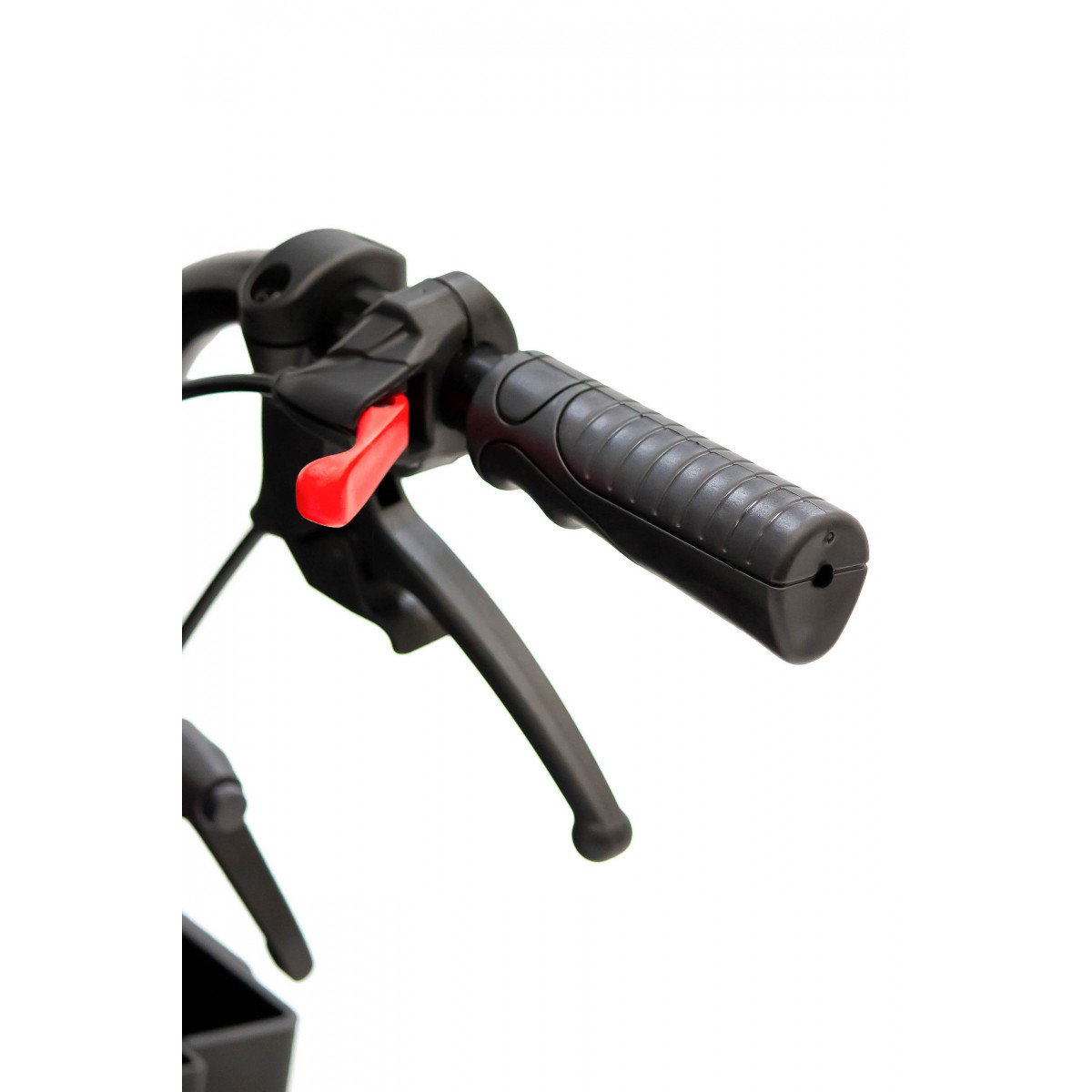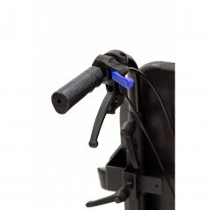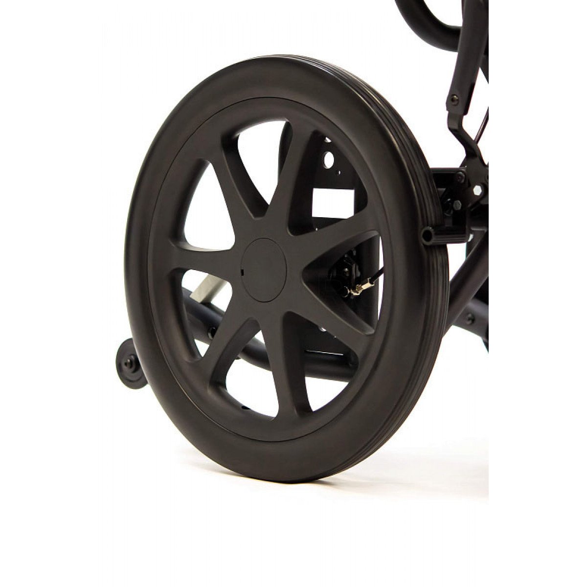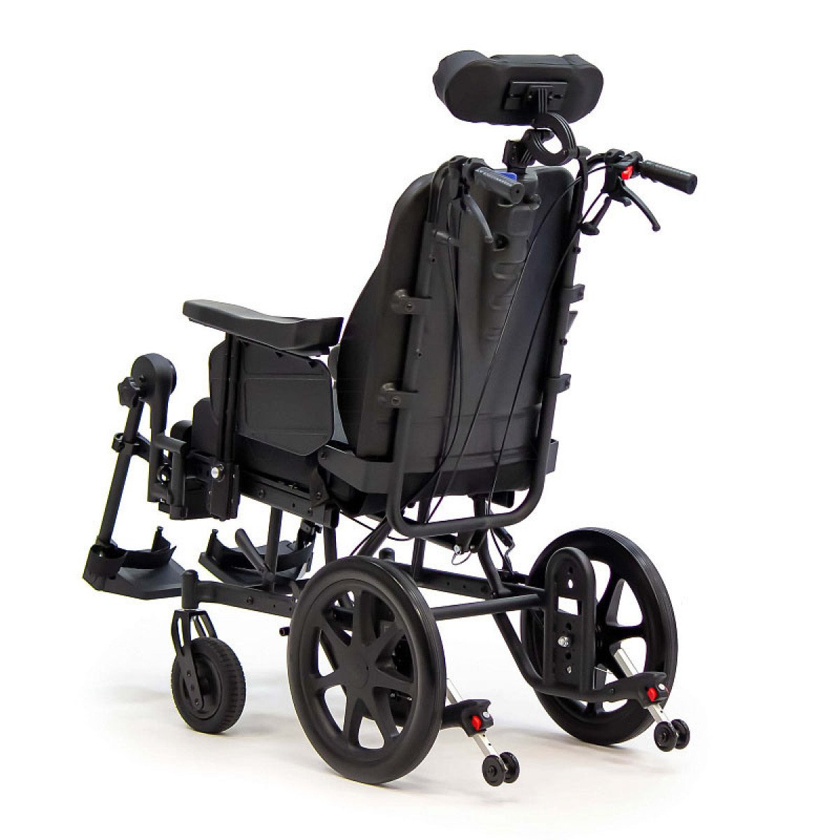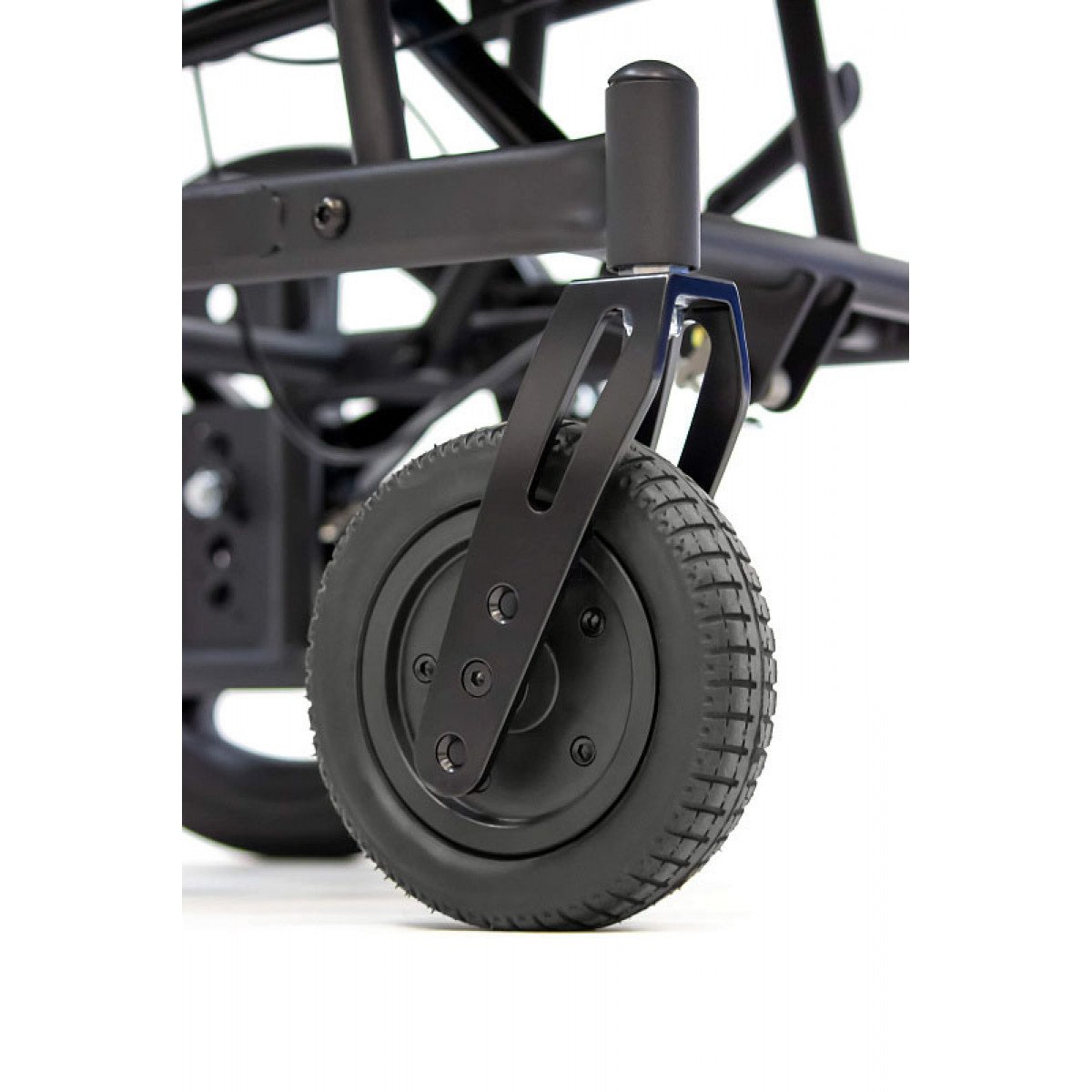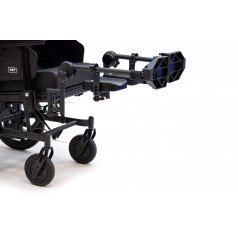 Задние литые колёса отвечают за надёжность и устойчивость на дороге, а передние пневматические — смягчают неровности и упрощают управление. Коляска оснащена боковыми стояночными тормозами и дополнительным управлением тормозами на ручках для сопровождающего. Антиопрокидыватели повышают устойчивость и делают передвижение безопаснее.