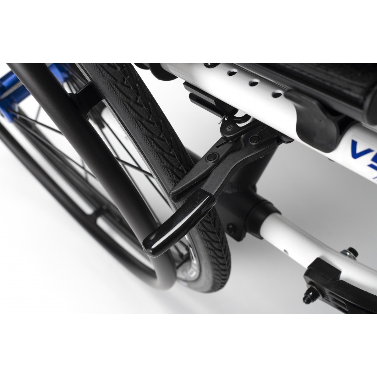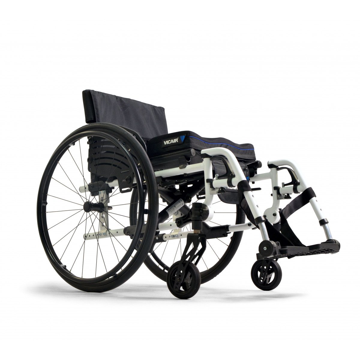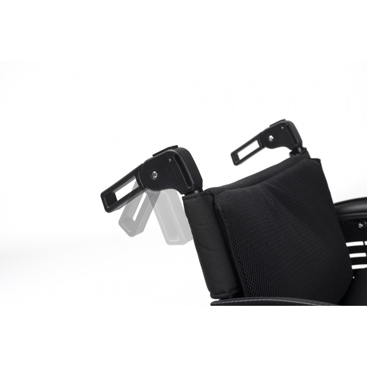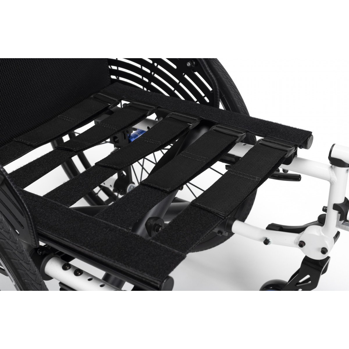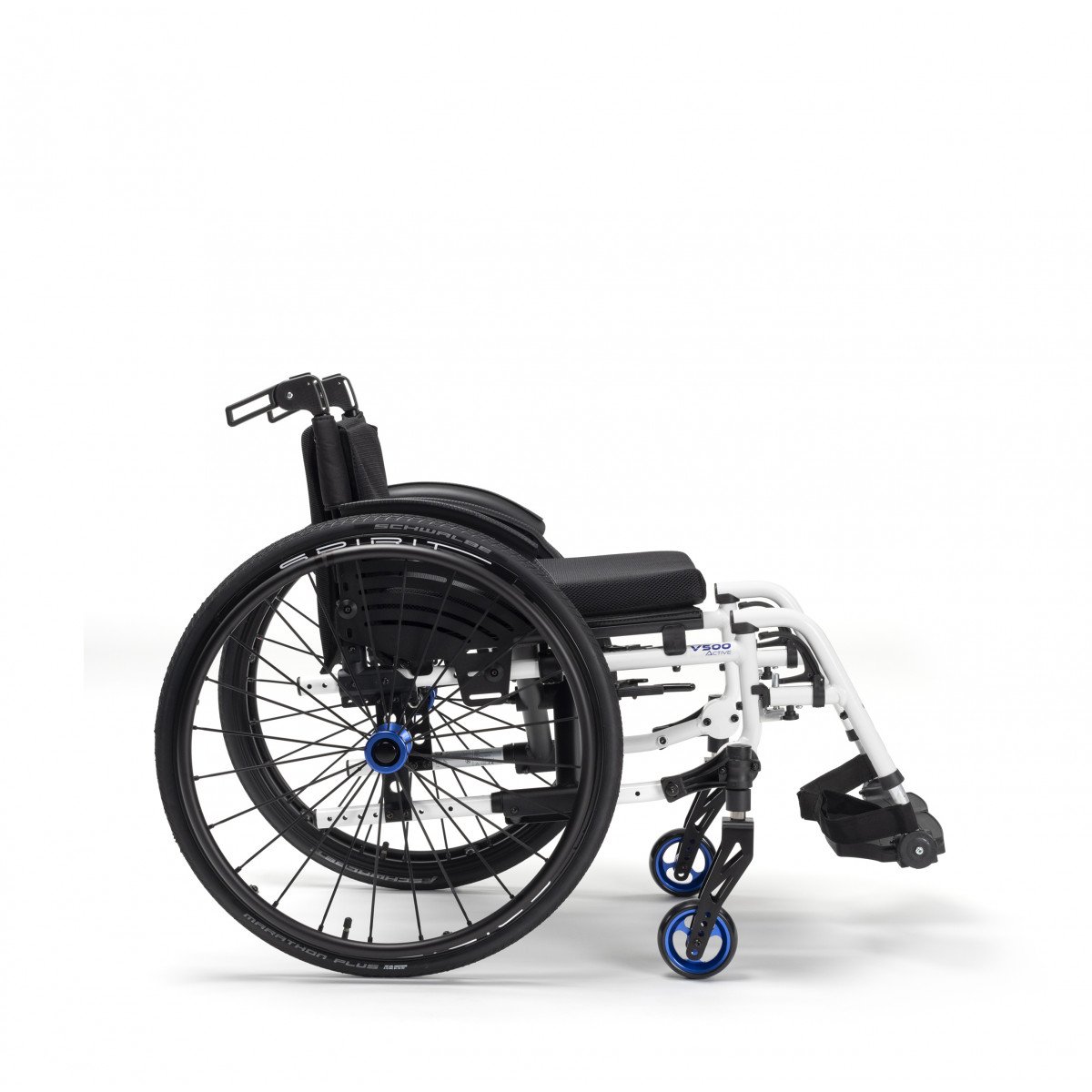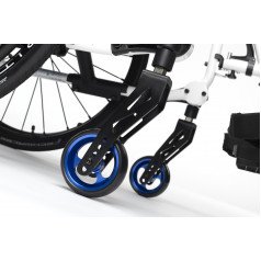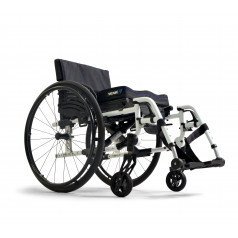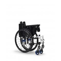 Вместо классических подлокотников активная инвалидная коляска оснащена защитными щитками. Особенностью данной модели является возможность настраивать натяжение спинки и сидения с использованием специальных ремней. Спинку можно регулировать по вертикали, а сидение – по глубине и высоте. Подножки имеют возможность снятия, а также могут быть отрегулированы по высоте или отведены в сторону.
