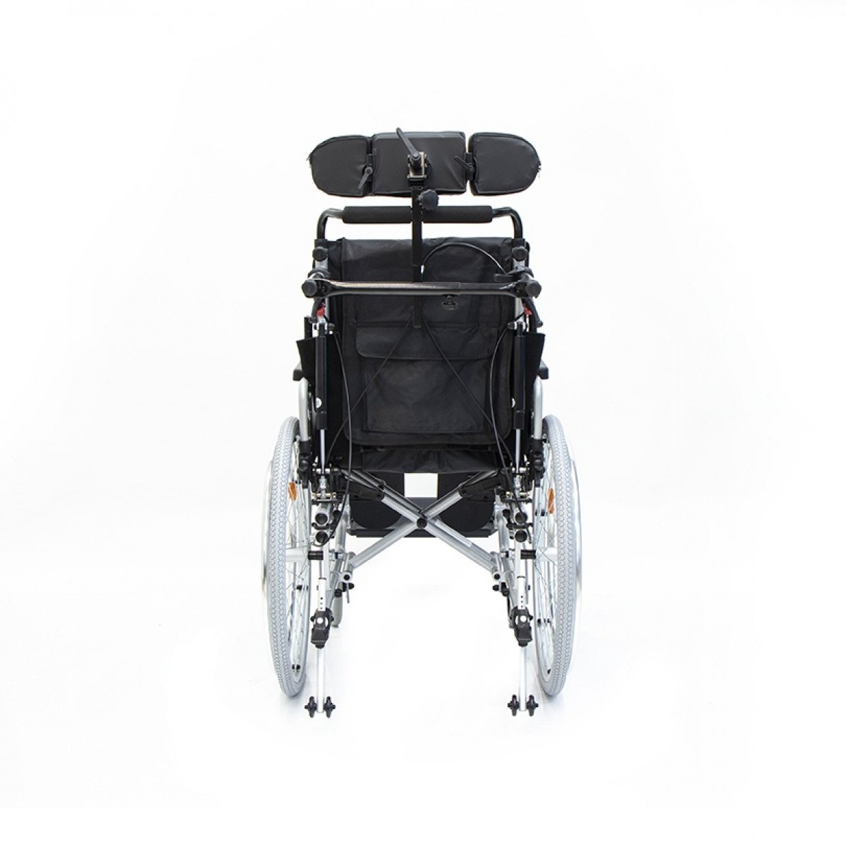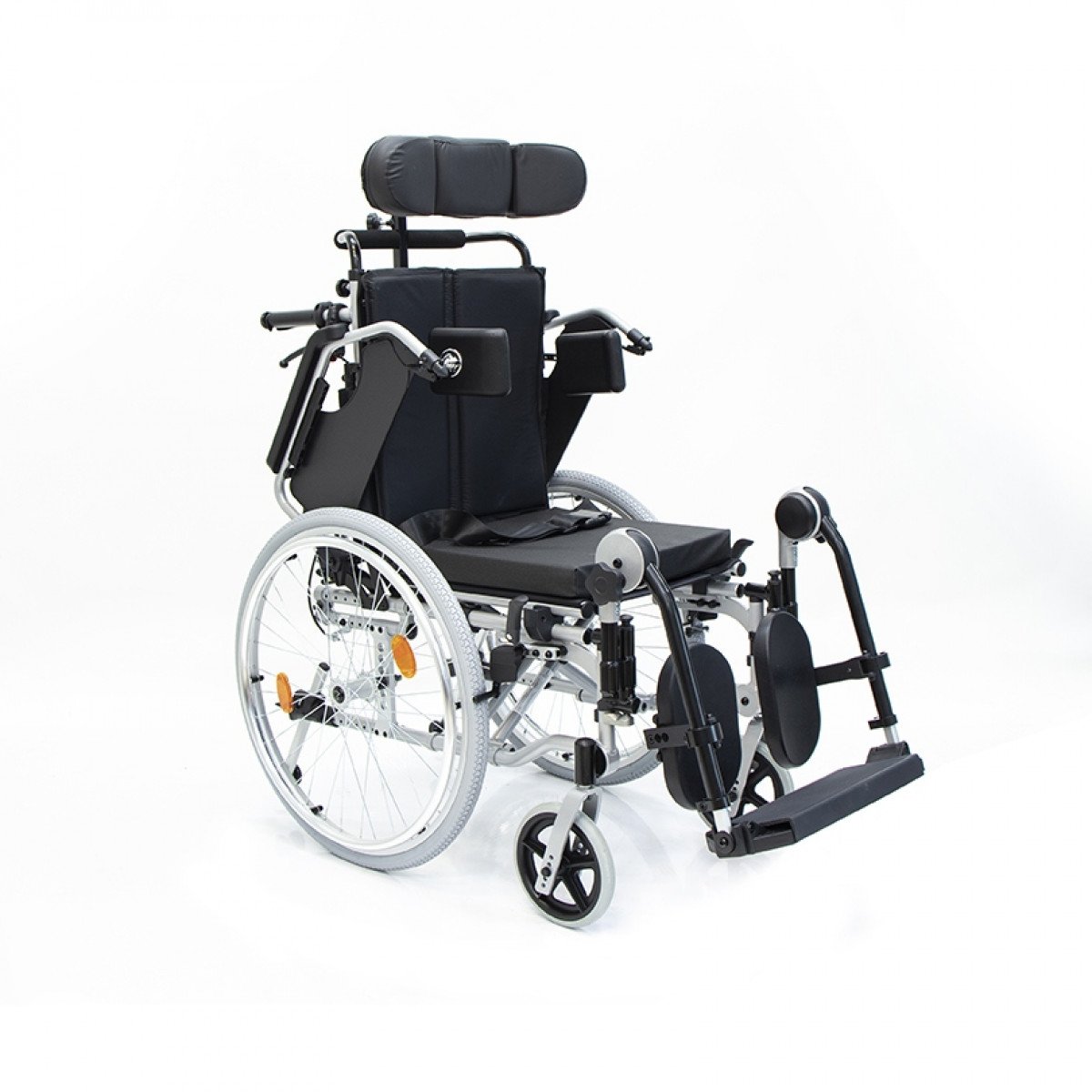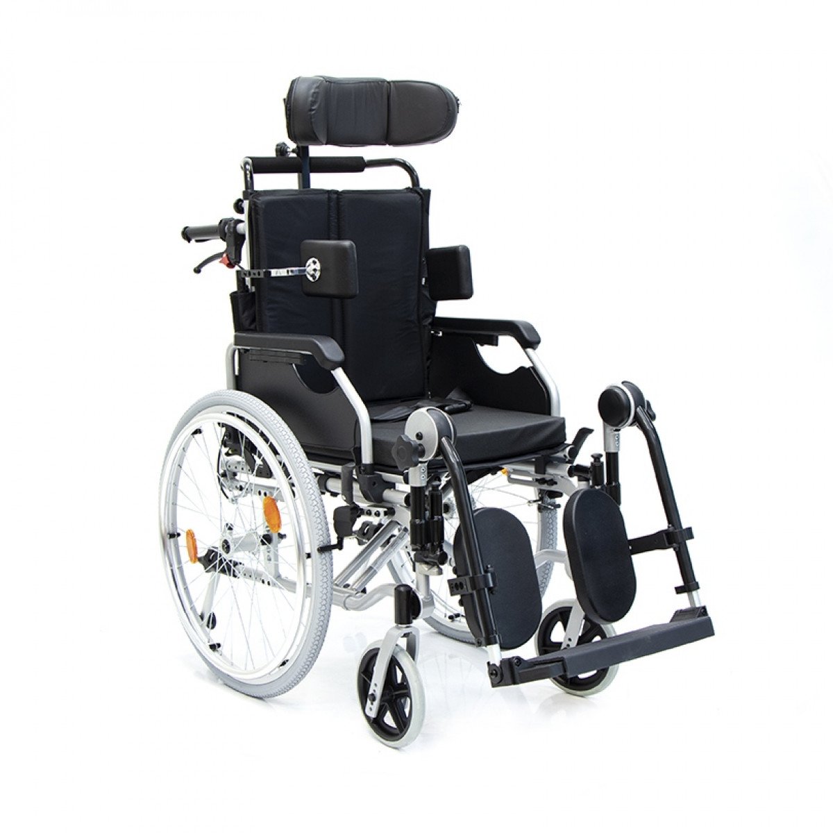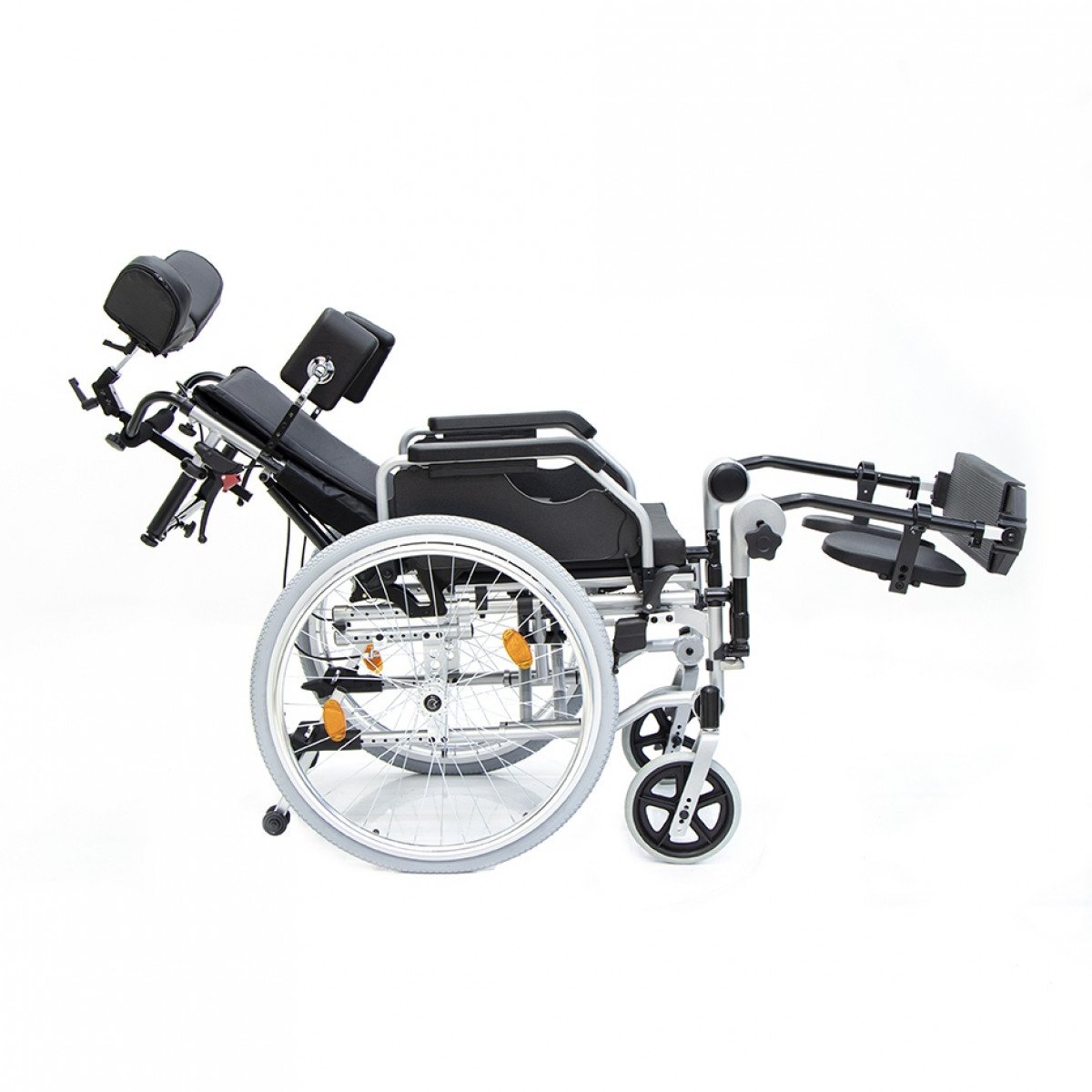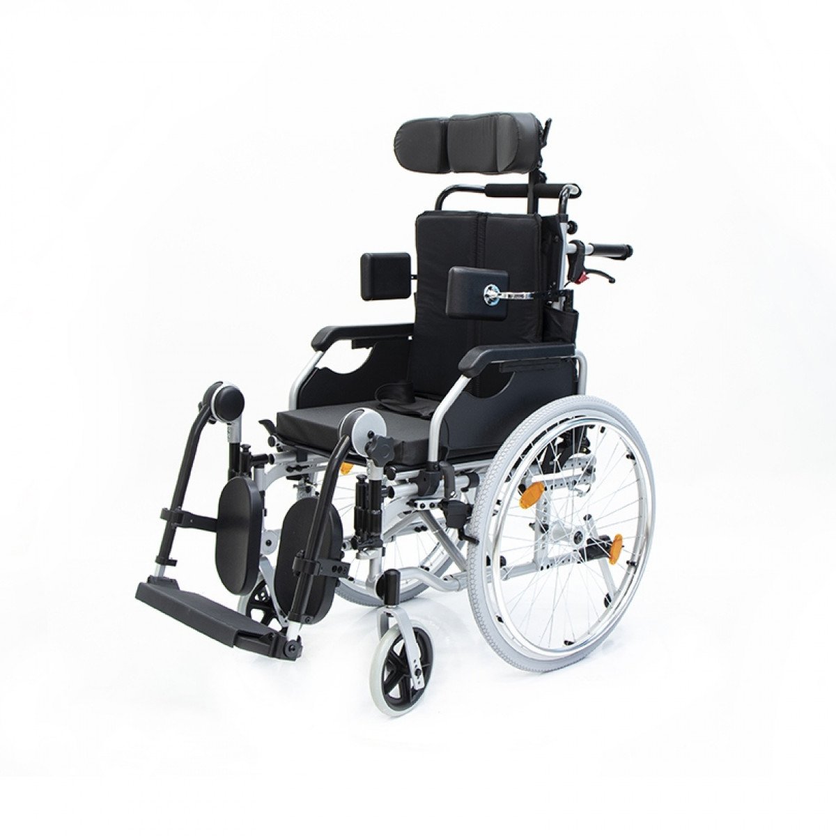 Коляска позволяет точно адаптировать положение пользователя: спинка регулируется по высоте и углу наклона и оснащена боковыми фиксаторами для поддержки корпуса. Сиденье настраивается по высоте, глубине и наклону, что помогает снизить нагрузку и подобрать удобную посадку. Подлокотники регулируются, при необходимости снимаются или откидываются, упрощая пересаживание.