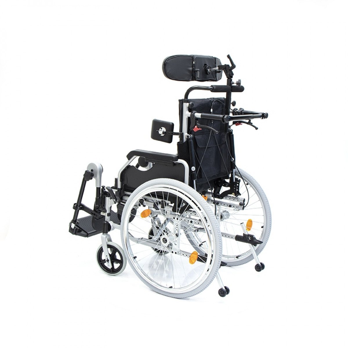 Подножки регулируются по высоте и углу наклона, оснащены ложементами и упорами для коленей для дополнительной фиксации. Опоры для стоп раздельные, при необходимости их можно объединить в единую платформу. Колёса доступны в вариантах: цельнолитые или пневматические, а для устойчивости предусмотрен антиопрокидыватель с регулировкой по высоте. Прочная алюминиевая рама с антикоррозийным покрытием обеспечивает надёжность и долгий срок службы.