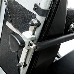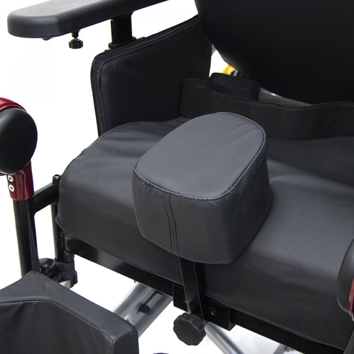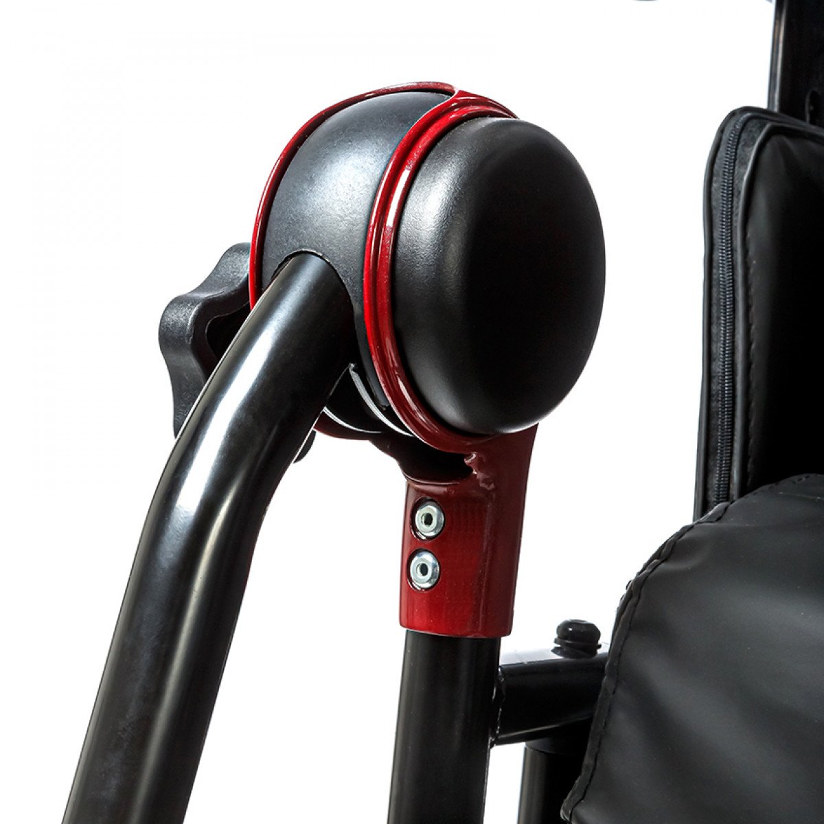 Подножки регулируются по высоте и углу наклона, оснащены мягкими ложементами и упорами для коленей для дополнительной фиксации. Раздельные опоры для стоп можно настроить по положению. Передние и задние колёса доступны в вариантах: цельнолитые или пневматические — под разные условия эксплуатации. Для устойчивости предусмотрены антиопрокидыватели с регулировкой по высоте. Прочная алюминиевая рама с антикоррозийным покрытием рассчитана на длительное использование.
