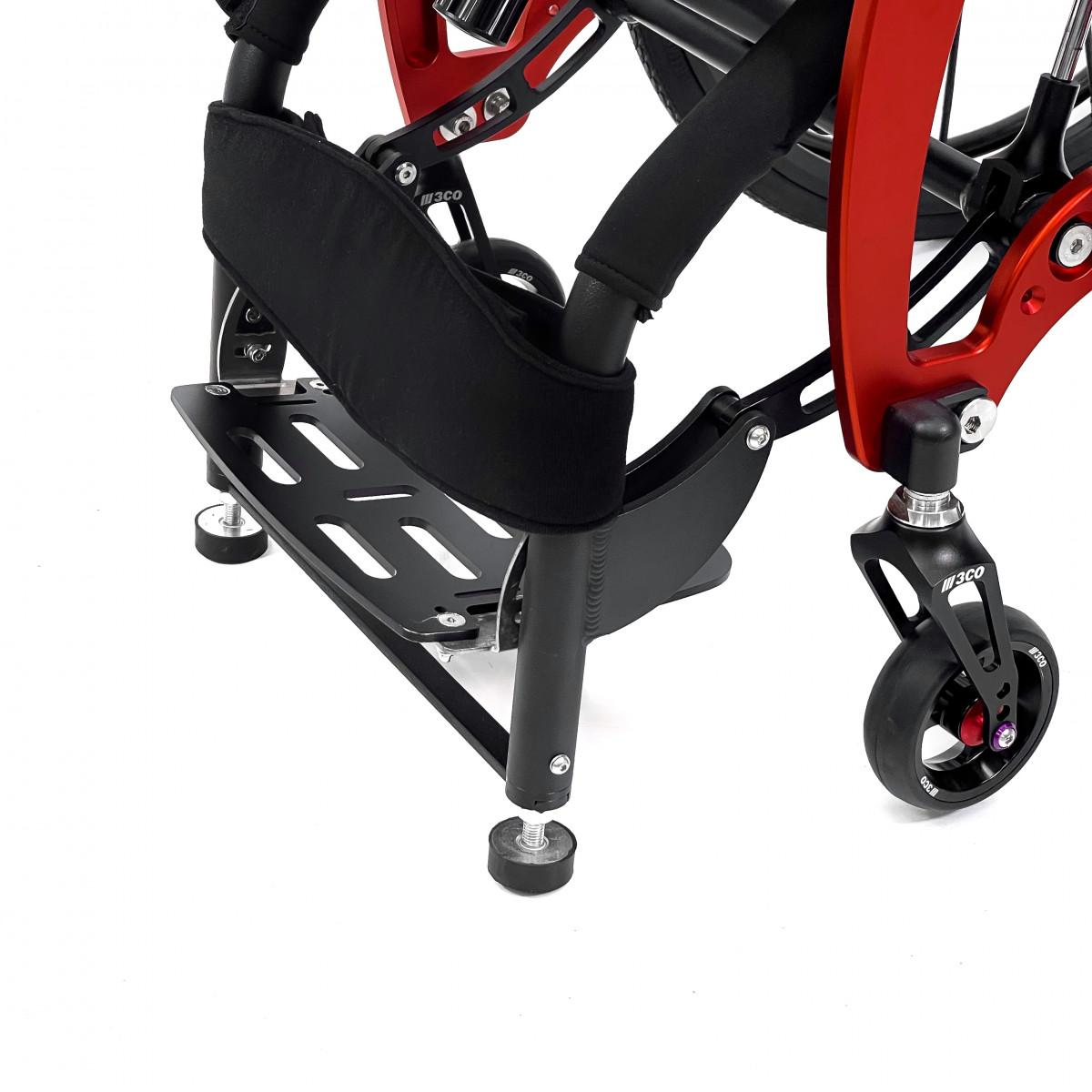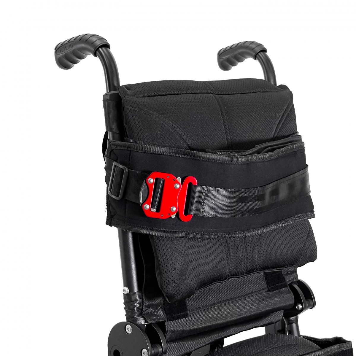 Механизм подъёма работает плавно и фиксируется в нужном положении, а ремни обеспечивают надёжную поддержку и безопасность. Вилки передних колёс регулируются по высоте, что помогает точнее настроить посадку. Обода с антискользящим покрытием упрощают управление, а стояночные тормоза обеспечивают контроль при остановке.