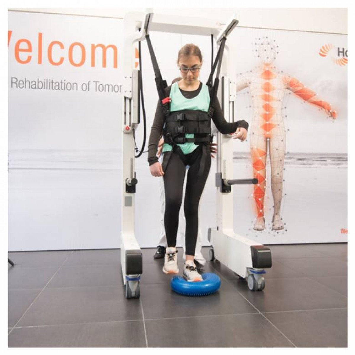 Система плавно разгружает вес пользователя и подходит для людей с разным уровнем физической подготовки, в том числе в период восстановления после травм, переломов и ортопедических операций. Электрический подъёмник помогает безопасно перейти из положения сидя в положение стоя, а встроенная защита автоматически останавливает систему при потере равновесия или спотыкании. Это снижает риски и позволяет сосредоточиться на самом процессе ходьбы.